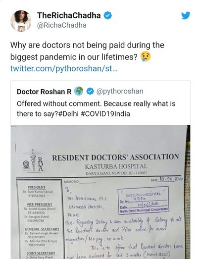 Richa Chadha speaks on non payment of dues for doctors in DelhiRicha Chadha speaks on non-payment of dues for doctors in De...